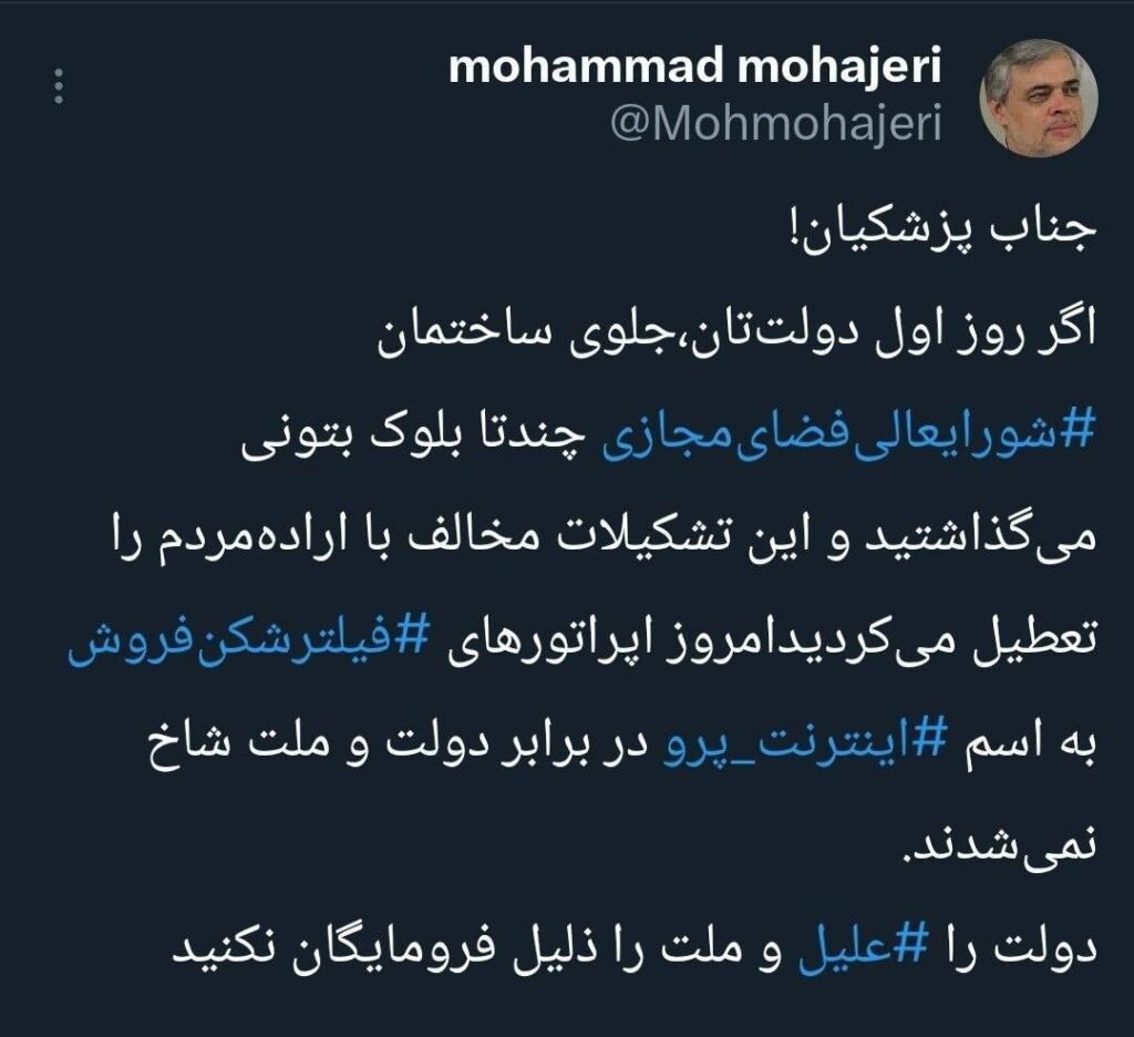 اگر روز اول دولتتان،جلوی ساختمان #شورایعالیفضایمجازی چندتا بلوک بتونی میگذاشتید و این تشکیلات مخالف با ارادهمردم را تعطیل میکردیدامروز اپراتورهای #فیلترشکنفروش به اسم #اینترنت_پرو در برابر دولت و ملت شاخ نمیشدند.