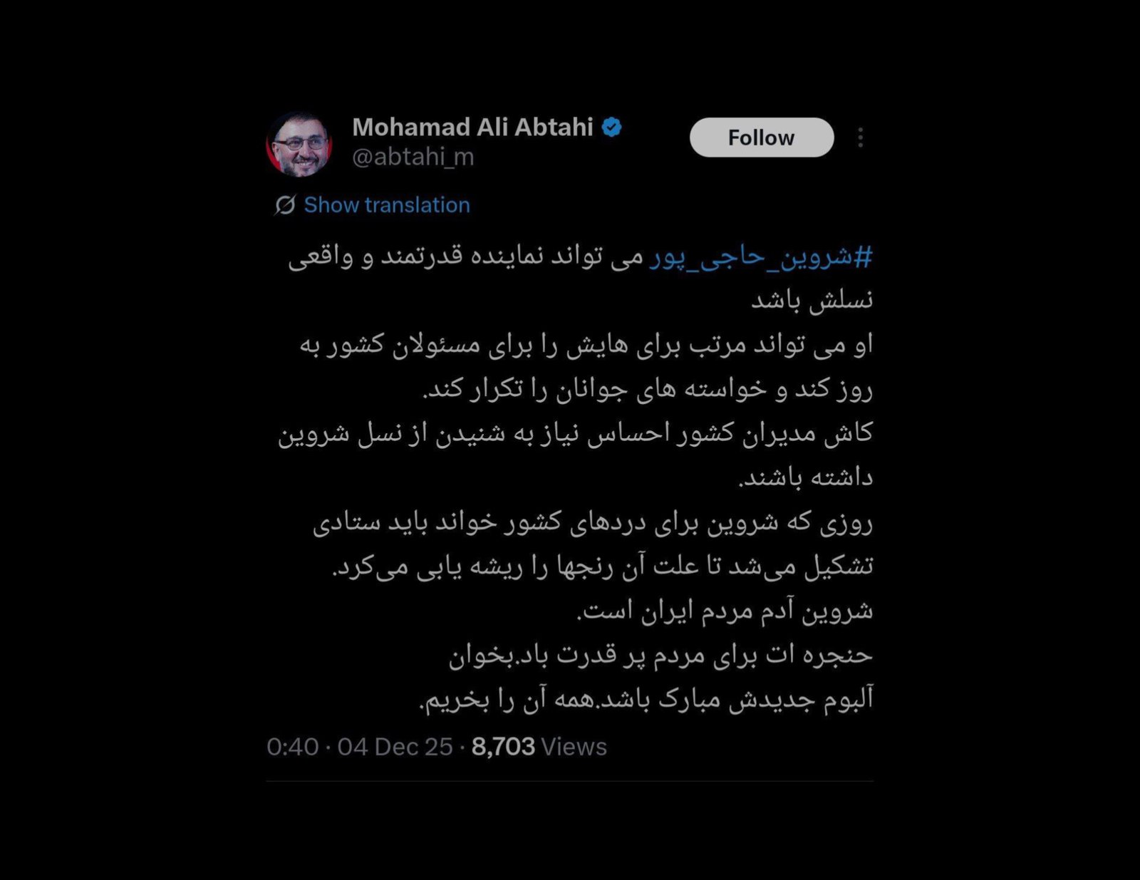 #شروین_حاجی_پور می تواند نماینده قدرتمند و واقعی نسلش باشد او می تواند مرتب برای هایش را برای مسئولان کشور به روز کند و خواسته های جوانان را تکرار کند. کاش مدیران کشور احساس نیاز به شنیدن از نسل شروین داشته باشند. روزی که شروین برای دردهای کشور خواند باید ستادی تشکیل میشد تا…