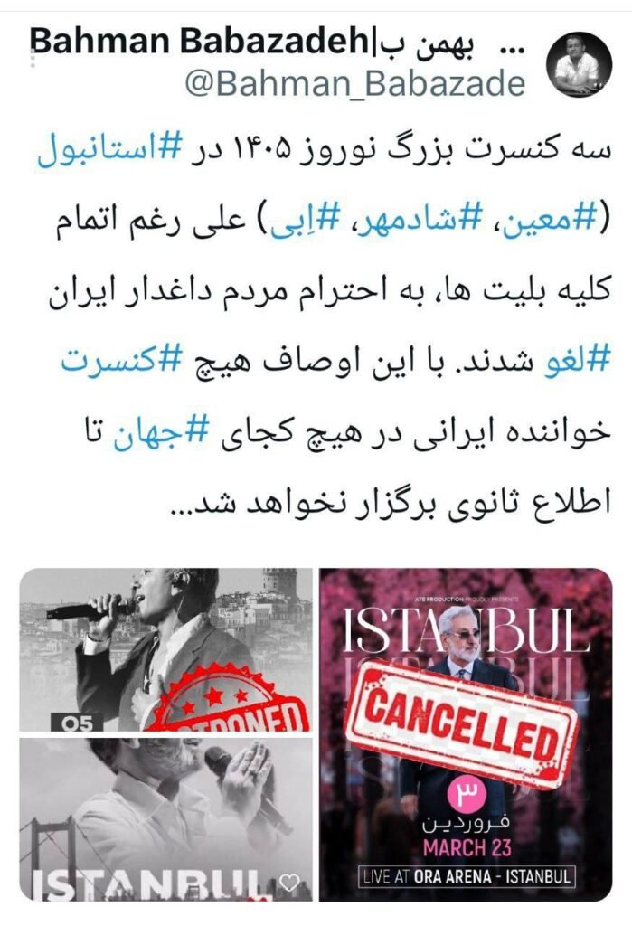 سه کنسرت بزرگ نوروز ۱۴۰۵ در #استانبول (#معین، #شادمهر، #اِبی) علی رغم اتمام کلیه بلیت ها، به احترام مردم داغدار ایران #لغو شدند. با این اوصاف هیچ #کنسرت خواننده ایرانی در هیچ کجای #جهان تا اطلاع ثانوی برگزار نخواهد شد… pic.twitter.com/UDrhqS1kFc