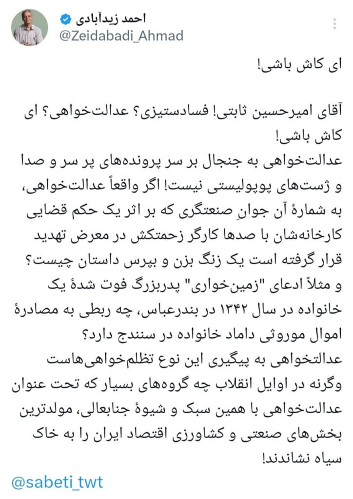 احمد زید آبادی خطاب به ثابتی: عدالت‌خواهی با شعار و جنجال نمی‌آید؛ با انصاف و مسئولیت می‌آید! اگر دنبال عدالتید، از مردم شروع کنید، نه از تریبون‌ها !