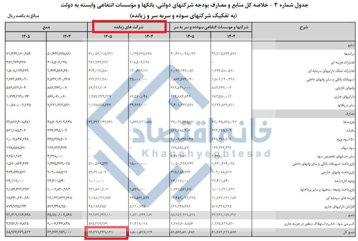براساس لایحه بودجه سال ۱۴۰۵، از بودجه ۸۸۹۷ همتی شرکتهای دولتی، ۳۶۴۰ همت از آن مربوط به بودجه شرکتهای دولتی زیانده و ۵۲۵۷ همت از آن نیز مربوط به بودجه شرکتهای سودده یا سربهسر است.