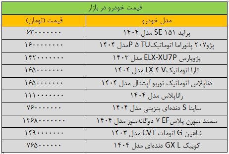 پراید ۱۵۱ SE  مدل ۱۴۰۴ به قیمت ۶۳۰ میلیون تومان رسیده است. قیمت اطلس اتوماتیک E پلاس هم یک میلیارد و ۲۰۰ میلیون تومان قیمت خورده است.
