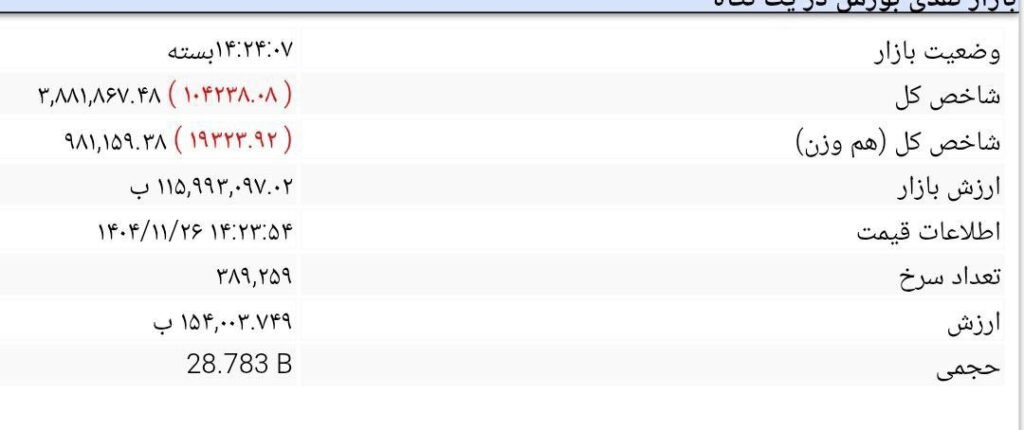 - شاخص کل بورس با ریزش ۲۱ هزار واحدی در پایان معاملات امروز به ۳ میلیون و ۲۸۲ هزار واحد رسید