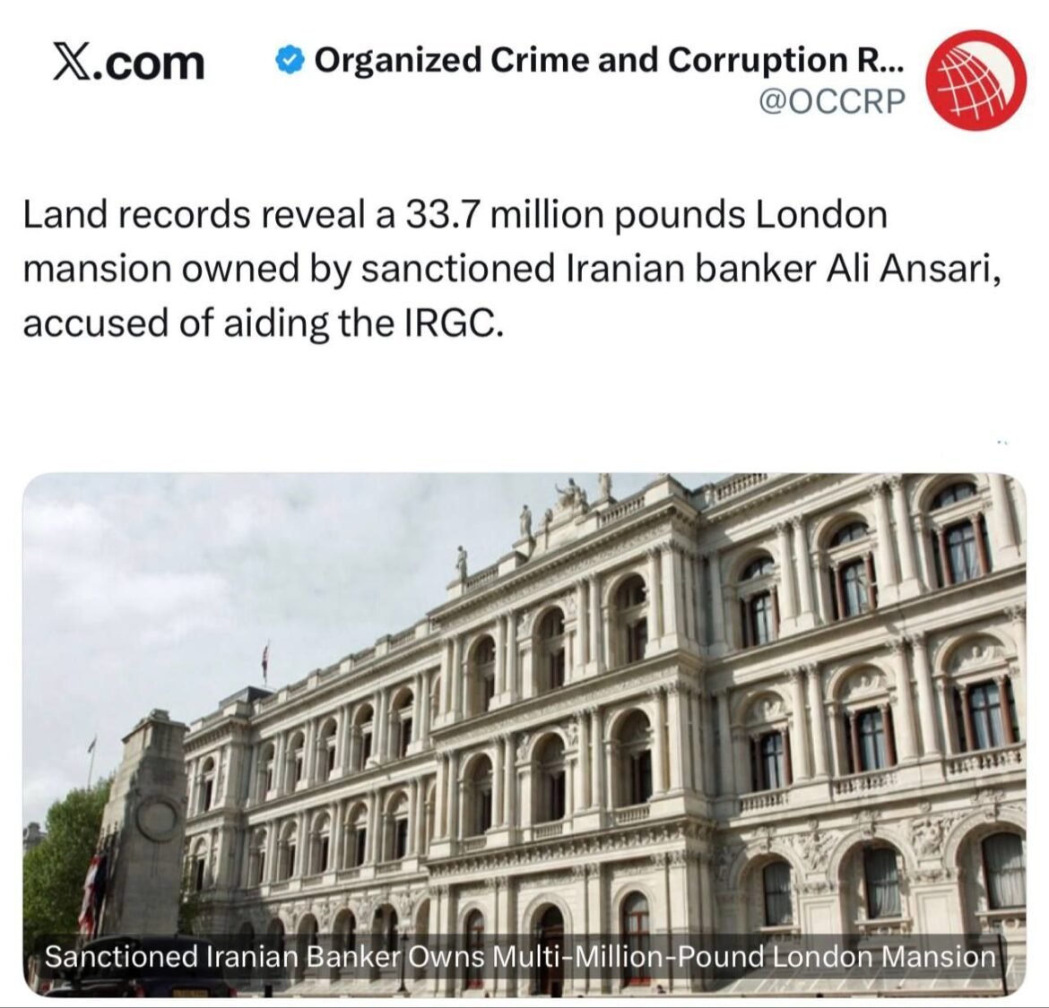سازمان گزارش‌دهی جرایم: علی انصاری، مالک بانک آینده، مالک یک عمارت ۳۳.۷ میلیون پوندی ( ۵٠ میلیون دلاری) در یکی از محله‌های اعیان‌نشین لندن است.