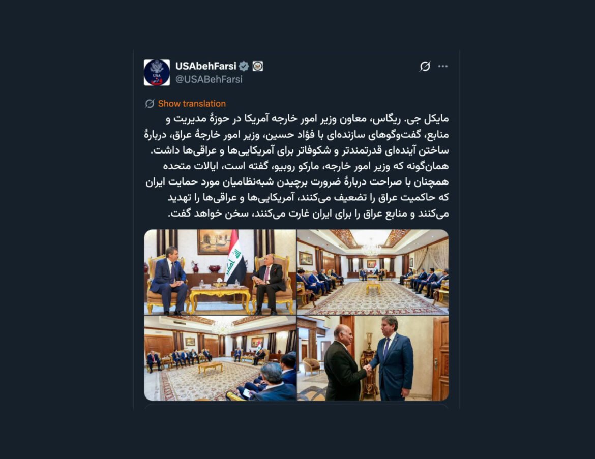 توییت اکانت فارسی آمریکا: با عراق برای ضرورت برچیدن شبه‌نظامیانی که منابع عراق را برای ایران غارت می‌کنند گفتگو خواهیم کرد