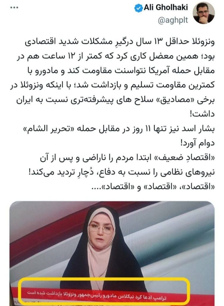 ونزوئلا حداقل ۱۳ سال درگیرِ مشکلات شدید اقتصادی بود؛ همین معضل کاری کرد که کمتر از ۱۲ ساعت هم در مقابل حمله آمریکا نتوانست مقاومت کند و مادورو با کمترین مقاومت تسلیم و بازداشت شد؛ با اینکه ونزوئلا در برخی «مصادیق» سلاح های پیشرفته‌تری نسبت به ایران داشت!