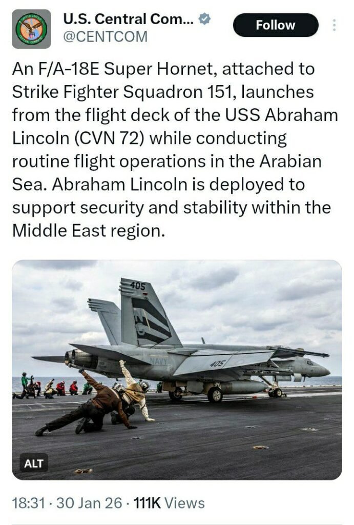 فرماندهی مرکزی آمریکا سنتکام: یک فروند جنگنده سوپر هورنت F/A-18E، متصل به اسکادران ۱۵۱ جنگنده تهاجمی، در حین انجام عملیات پروازی معمول در دریای عرب، از عرشه پرواز ناو هواپیمابر آبراهام لینکلن (CVN 72) پرتاب میشود.آبراهام لینکلن برای حمایت از امنیت و ثبات در منطقه خاورمیانه مستقر شده است.