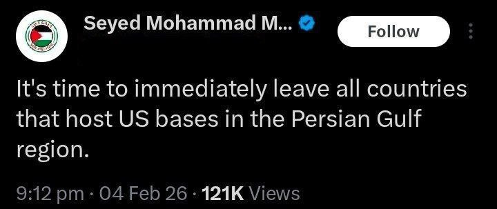 این مشاور تیم مذاکره کننده در پیامی در شبکه اجتماعی ایکس (توییتر سابق) نوشت: زمان آن رسیده که فوراً همه کشورهایی که میزبان پایگاههای آمریکا در منطقه خلیج فارس هستند، این کشورها را ترک کنند.