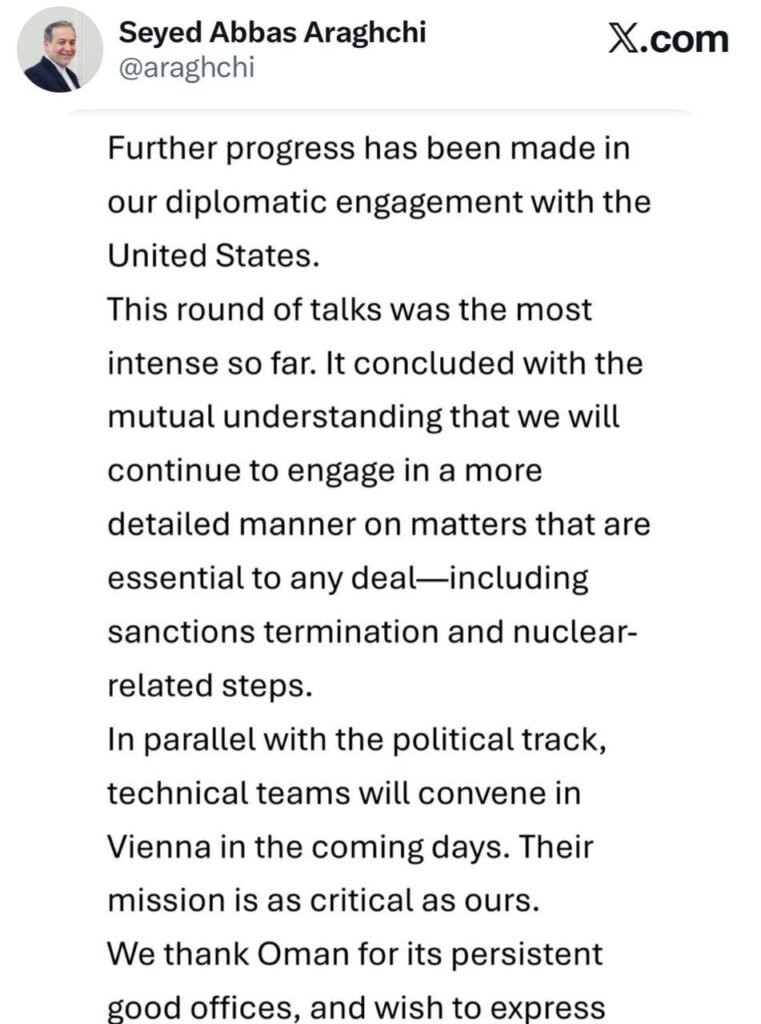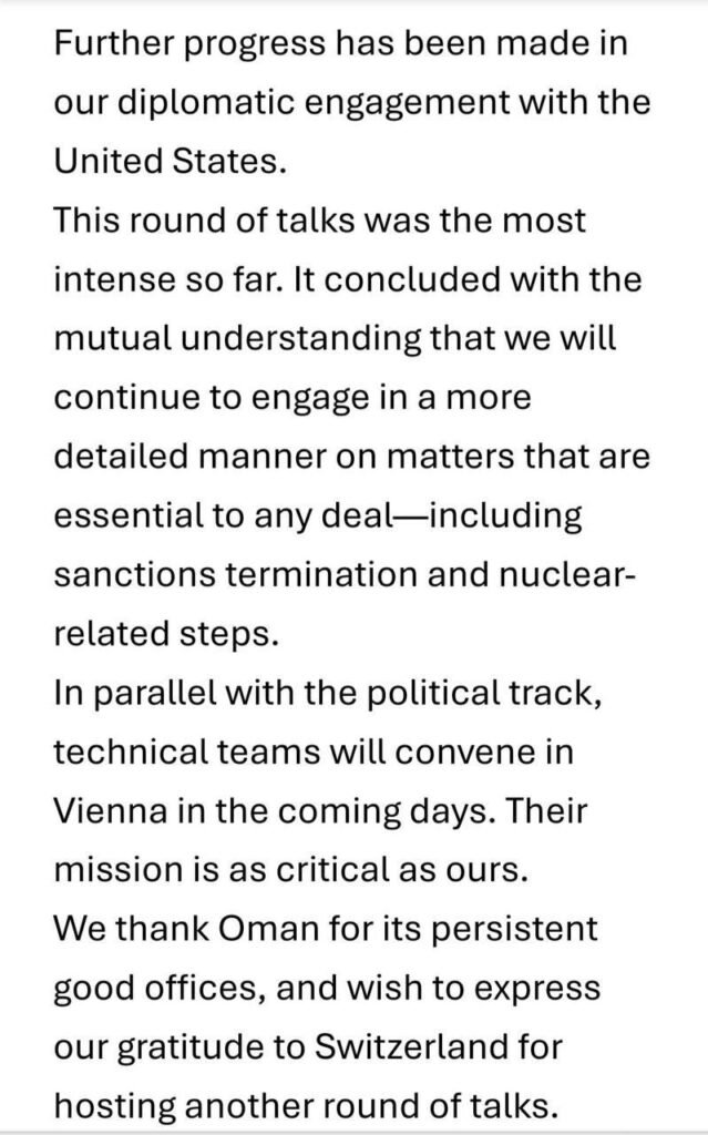 پیشرفت بیشتری در تعامل دیپلماتیک ما با ایالات متحده حاصل شده است. این دور از مذاکرات، فشردهترین مرحله تاکنون بود. این گفتوگوها با این درک متقابل به پایان رسید که در خصوص موضوعات اساسی برای هرگونه توافق، از جمله لغو تحریمها و گامهای مرتبط با حوزه هستهای، بهصورت جزئیتر و دقیقتر به رایزنیها ادامه خواهیم داد.