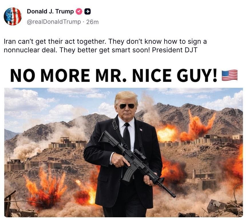 روی تصویری که با هوش مصنوعی تولید شده با فونت بزرگ هم نوشته شده: NO MORE MR. NICE GUY! 🇺🇸