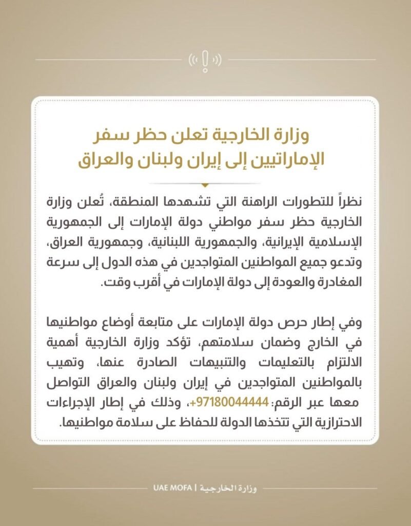 امارات متحده عربی ممنوعیت سفر اماراتیها به ایران، لبنان و عراق را اعلام کرد و از شهروندان خود خواست فوراً این کشورها را ترک کنند توسط saba ۱۴۰۵/۰۲/۱۱