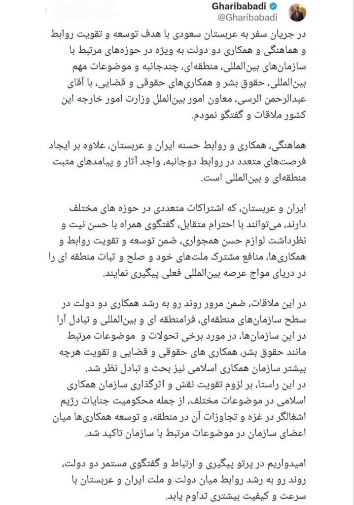 در جریان سفر به عربستان سعودی با هدف توسعه و تقویت روابط و هماهنگی و همکاری دو دولت به ویژه در حوزههای مرتبط با سازمانهای بینالمللی، منطقهای، چندجانبه و موضوعات مهم بینالمللی، حقوق بشر و همکاریهای حقوقی و قضایی، با آقای عبدالرحمن الرسی، معاون امور بینالملل وزارت امور خارجه… pic.twitter.com/ebylXDdYsL