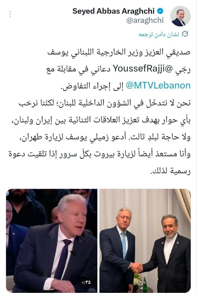 صديقي العزيز وزير الخارجية اللبناني يوسف رجّي @YoussefRajji دعاني في مقابلة مع @MTVLebanon إلى إجراء التفاوض. نحن لا نتدخّل في الشؤون الداخلية للبنان؛ لكنّنا نرحّب بأي حوار بهدف تعزيز العلاقات الثنائية بين إيران ولبنان، ولا حاجة لبلدٍ ثالث. أدعو زميلي يوسف لزيارة طهران، وأنا… pic.twitter.com/gD8pqbmkab