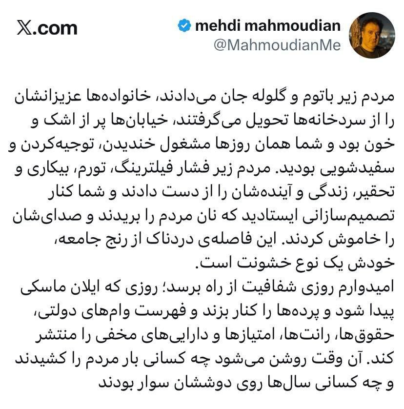 امیدوارم روزی شفافیت از راه برسد؛ روزی که ایلان ماسکی پیدا شود و پردهها را کنار بزند و فهرست وامهای دولتی، حقوقها، رانتها، امتیازها و داراییهای مخفی را منتشر کند. آن وقت روشن میشود چه کسانی بار مردم را کشیدند و چه کسانی سالها روی دوششان سوار بودند.