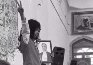 هانا، دختر زندهیاد خسرو علیکردی، با در دست داشتن عکس پدر جانباختهاش به دیگر دختران دادخواه پیوست