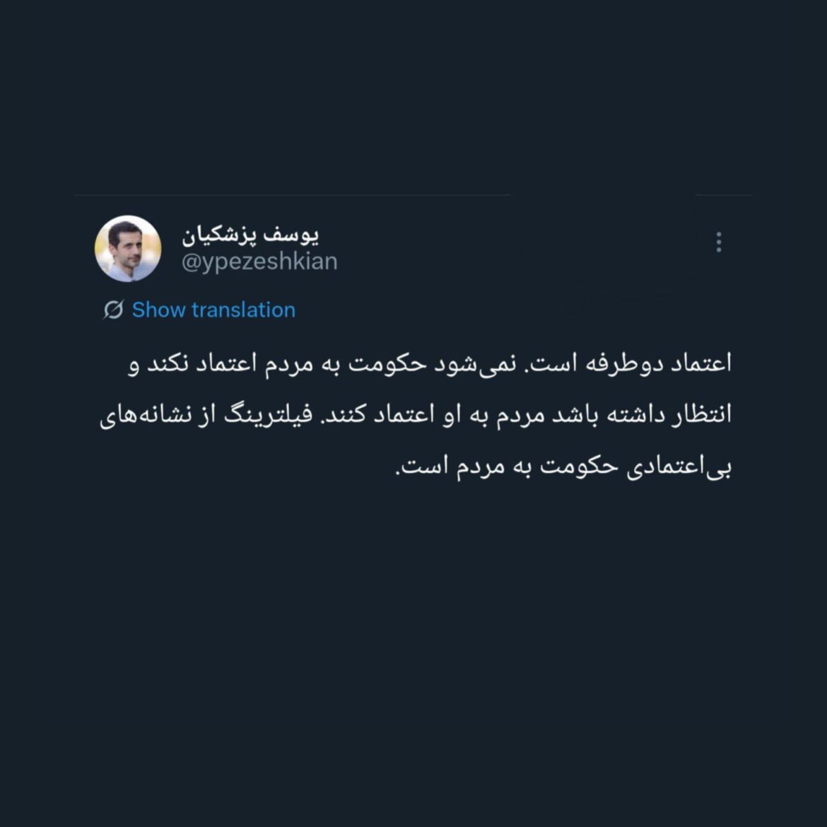 اعتماد دوطرفه است. نمیشود حکومت به مردم اعتماد نکند و انتظار داشته باشد مردم به او اعتماد کنند. فیلترینگ از نشانههای بیاعتمادی حکومت به مردم است.