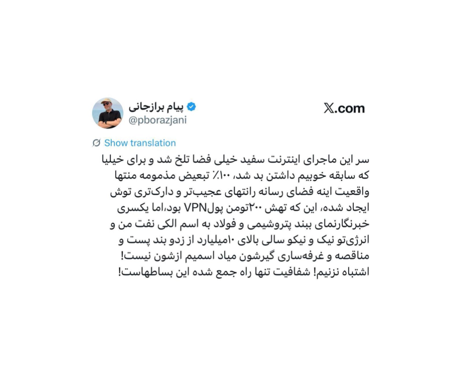 سر این ماجرای اینترنت سفید خیلی فضا تلخ شد و برای خیلیا که سابقه خوبیم داشتن بد شد، ۱۰۰٪ تبعیض مذمومه منتها واقعیت اینه فضای رسانه رانتهای عجیبتر و دارکتری توش ایجاد شده، این که تهش ۲۰۰تومن پولVPN بود،اما یکسری خبرنگارنمای ببند پتروشیمی و فولاد به اسم الکی نفت من و انرژیتو نیک…