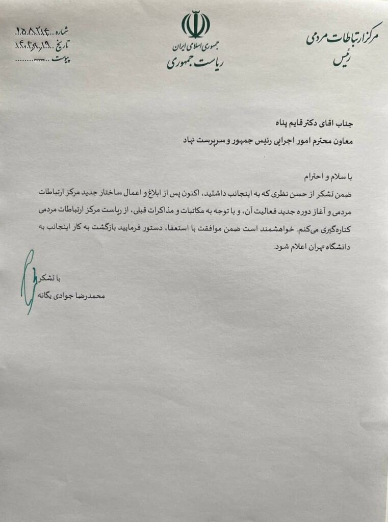 رئیس مرکز ارتباطات مردمی ریاستجمهوری از سمت خود استعفا کرد