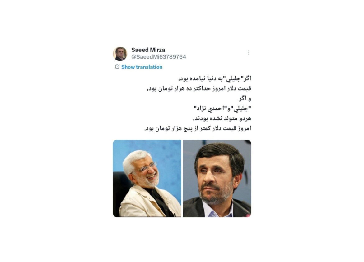 19اگر"جليلي"به دنيا نيامده بود،قيمت دلار امروز حداكثر ده هزار تومان بود،و اگر"جليلي"و"احمدي نژاد"هردو متولد نشده بودند،امروز قيمت دلار كمتر از پنج هزار تومان بود. pic.twitter.com/pemCW9OHTj— Saeed Mirza (@SaeedMi63789764) December 16, 2025 ممکن است به موارد زیر علاقهمند باشید واکنش روح الله جمعه ای به ادعای علم الهدی: او را به دستگاه قضایی معرفی کنید شبنم نعمت زاده هیچ حکم برائتی نگرفته است/ وثیقه 90 میلیارد تومانی وی ضبط شد سید محمد خاتمی: سخنهای تهدیدآمیز و تحریککننده روزنههای امید را میبندد نمایندگان مجلس با تحقیق و تفحص درباره عملکرد فیلترشکنها موافقت کردند