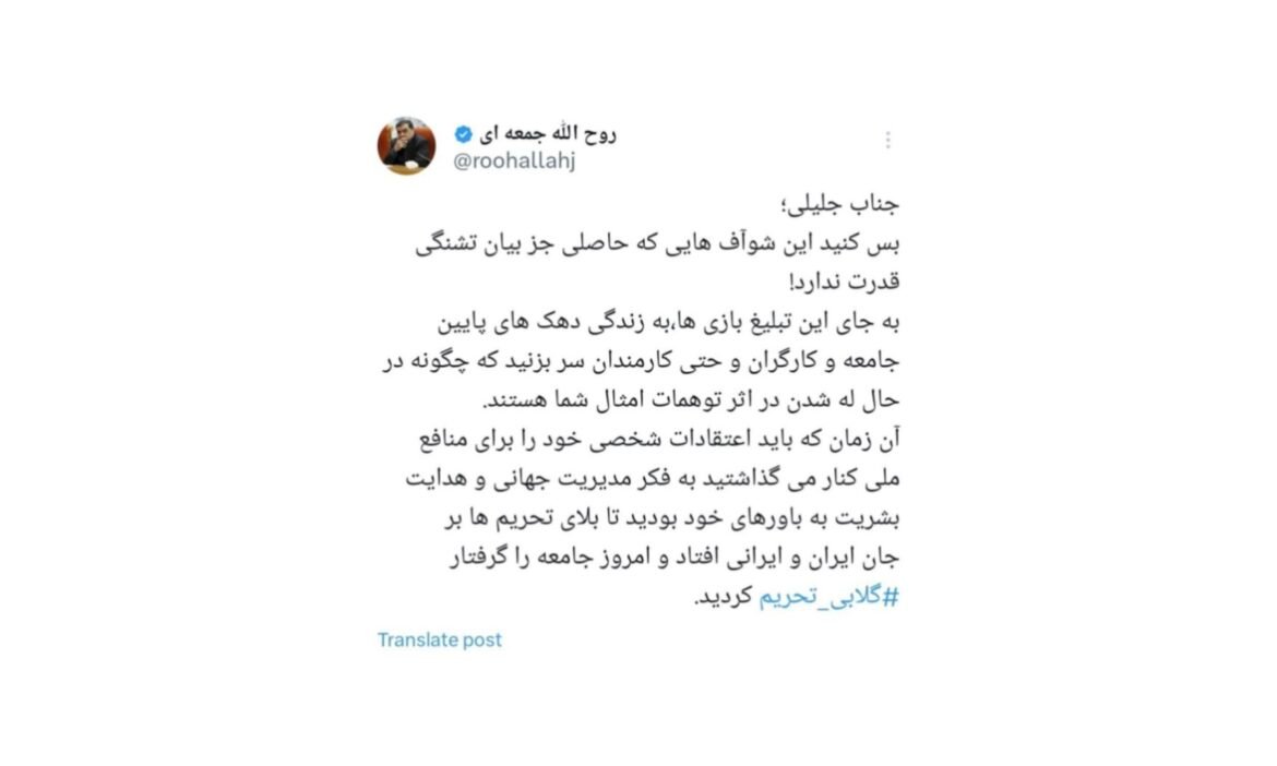 جناب جلیلی؛ بس کنید این شوآف هایی که حاصلی جز بیان تشنگی قدرت ندارد! به جای این تبلیغ بازی ها،به زندگی دهک های پایین جامعه و کارگران و حتی کارمندان سر بزنید که چگونه در حال له شدن در اثر توهمات امثال شما هستند. آن زمان که باید اعتقادات شخصی خود را برای منافع ملی کنار می گذاشتید… pic.twitter.com/sPfbtgKjHg
