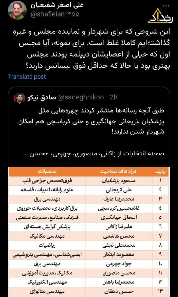 نظر متفاوت احمد مازنی رئیس اسبق کمیسیون فرهنگی مجلس درباره حجاب و عفاف: لطماتی که اختلاسها و برخی روحانیون و مسئولین به اعتماد مردم زدند بدتر از وضع حجاب است توسط saba ۱۴۰۴/۱۰/۰۶
