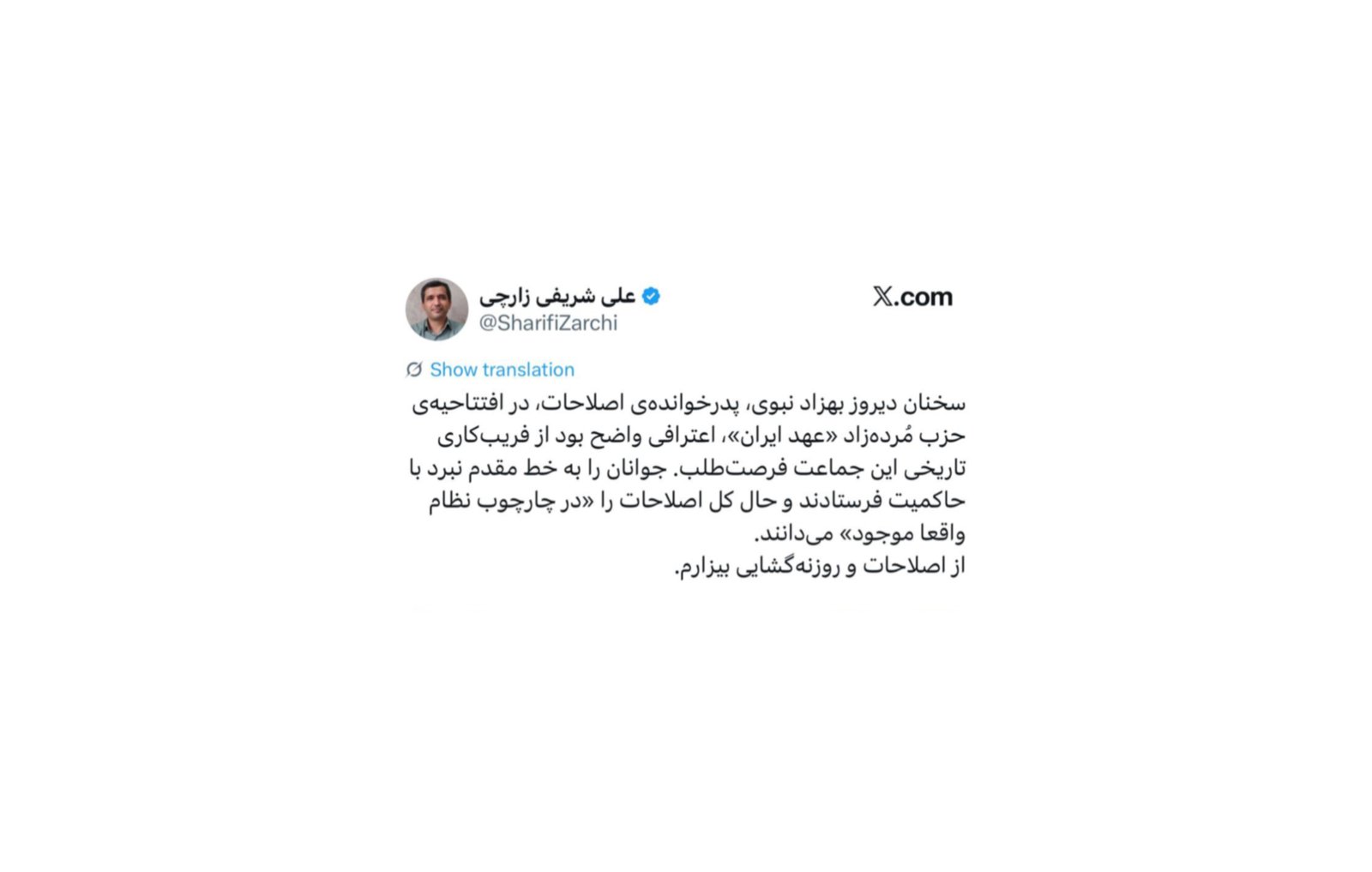سخنان دیروز بهزاد نبوی، پدرخواندهی اصلاحات، در افتتاحیهی حزب مُردهزاد «عهد ایران»، اعترافی واضح بود از فریبکاری تاریخی این جماعت فرصتطلب. جوانان را به خط مقدم نبرد با حاکمیت فرستادند و حال کل اصلاحات را «در چارچوب نظام واقعا موجود» میدانند. از اصلاحات و روزنهگشایی بیزارم. pic.twitter.com/rUtbft49lw