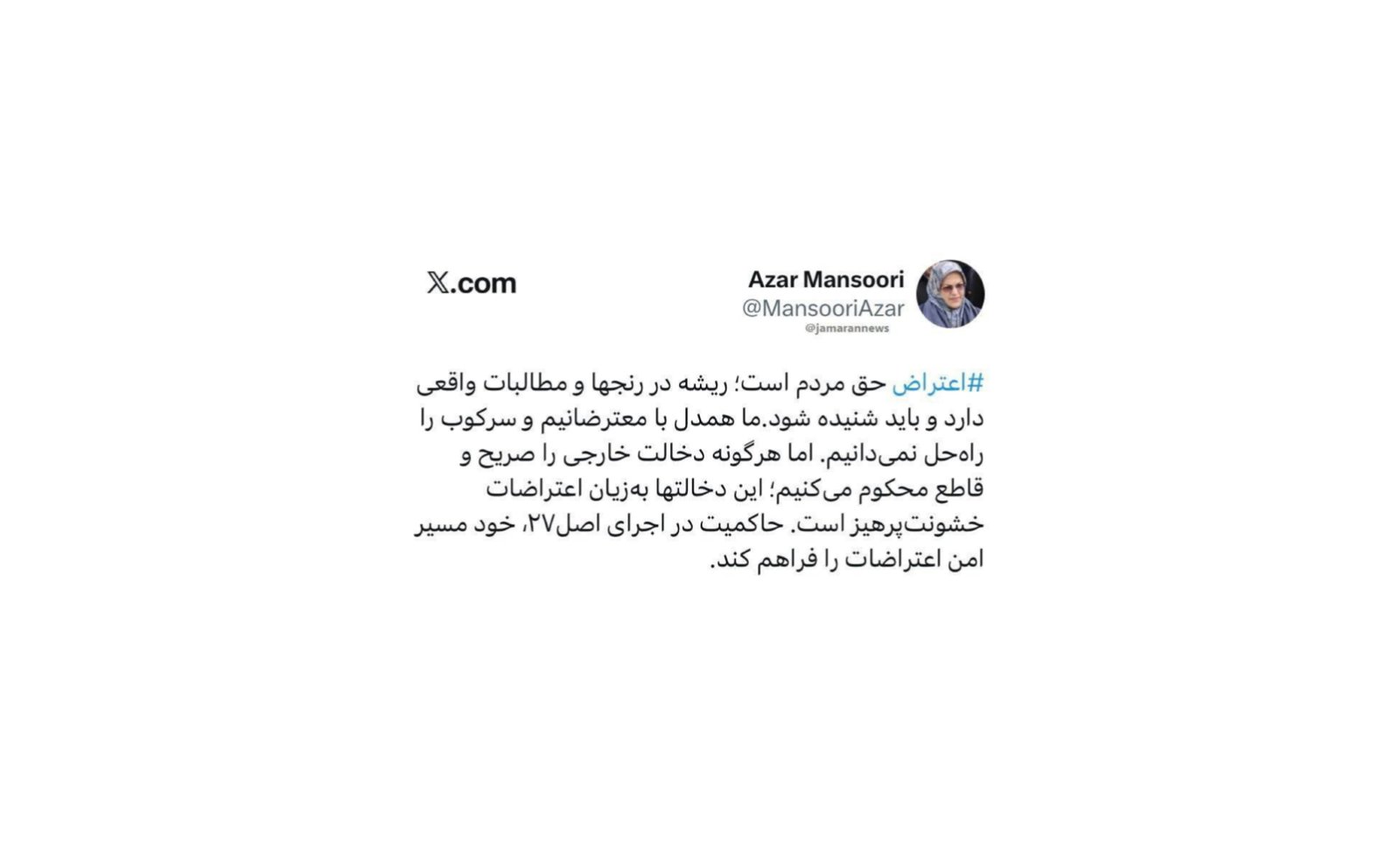 #اعتراض حق مردم است؛ ریشه در رنجها و مطالبات واقعی دارد و باید شنیده شود.ما همدل با معترضانیم و سرکوب را راهحل نمیدانیم. اما هرگونه دخالت خارجی را صریح و قاطع محکوم میکنیم؛ این دخالتها بهزیان اعتراضات خشونتپرهیز است. حاکمیت در اجرای اصل۲۷، خود مسیر امن اعتراضات را فراهم کند.