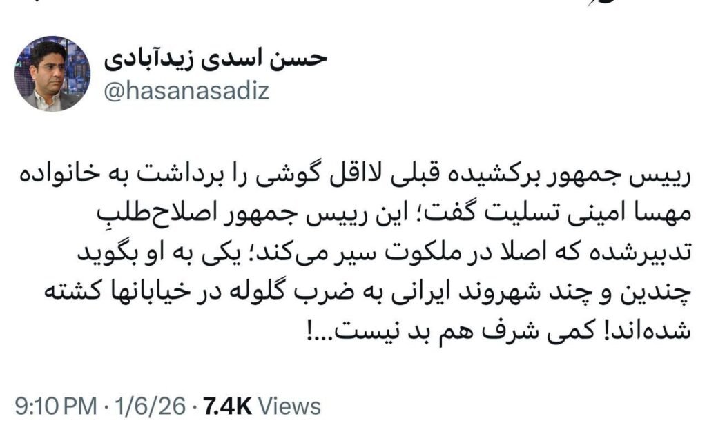 45رییس جمهور برکشیده قبلی لااقل گوشی را برداشت به خانواده مهسا امینی تسلیت گفت؛ این رییس جمهور اصلاحطلبِ تدبیرشده که اصلا در ملکوت سیر میکند؛ یکی به او بگوید چندین و چند شهروند ایرانی به ضرب گلوله در خیابانها کشته شدهاند! کمی شرف هم بد نیست…!— حسن اسدی زیدآبادی (@hasanasadiz) January 6, 2026 ممکن است به موارد زیر علاقهمند باشید شکست تیم بسکتبال سه نفره مردان ایران مقابل ساحل عاج درد هموطن / همه جای ایران سرای من است آخرین وضعیت سلامت رضا امیرخانی انتقاد مجری صداوسیما به عدم حمایت مناسب فدراسیون از دختران ایرانی در مسابقات بینالمللی