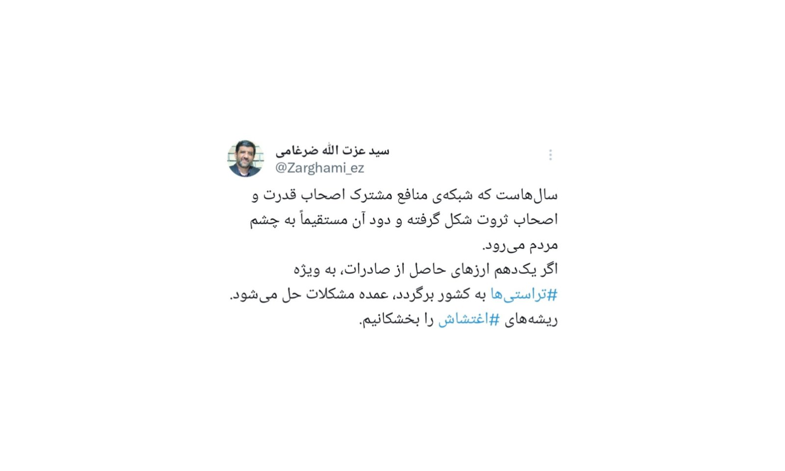 36سالهاست که شبکهی منافع مشترک اصحاب قدرت و اصحاب ثروت شکل گرفته و دود آن مستقیماً به چشم مردم میرود.اگر یکدهم ارزهای حاصل از صادرات، به ویژه #تراستیها به کشور برگردد، عمده مشکلات حل میشود.ریشههای #اغتشاش را بخشکانیم.— سید عزت الله ضرغامی (@Zarghami_ez) January 7, 2026 ممکن است به موارد زیر علاقهمند باشید بعد از جنگ، صداوسیما دوباره به رویکردهای سابق خود برگشت تحریم نعمت است اما برای آقازادهها/آقای عراقچی کدام برکت؟ واکنش محمد علی ابطحی به محسن رضایی: آمریکایی ها با ویزا میآیند؟ سرافراز و انتظاری از شورای عالی فضای مجازی حذف میشوند؟!