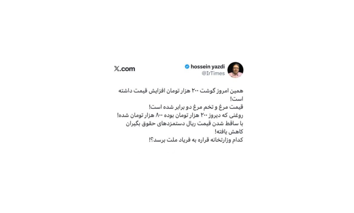 همین امروز گوشت ۲۰۰ هزار تومان افزایش قیمت داشته است! قیمت مرغ و تخم مرغ دو برابر شده است! روغنی که دیروز ۲۰۰ هزار تومان بوده ۸۰۰ هزار تومان شده! با ساقط شدن قیمت ریال دستمزدهای حقوق بگیران کاهش یافته! کدام وزارتخانه قراره به فریاد ملت برسد؟! pic.twitter.com/ZrfwIWuMdh