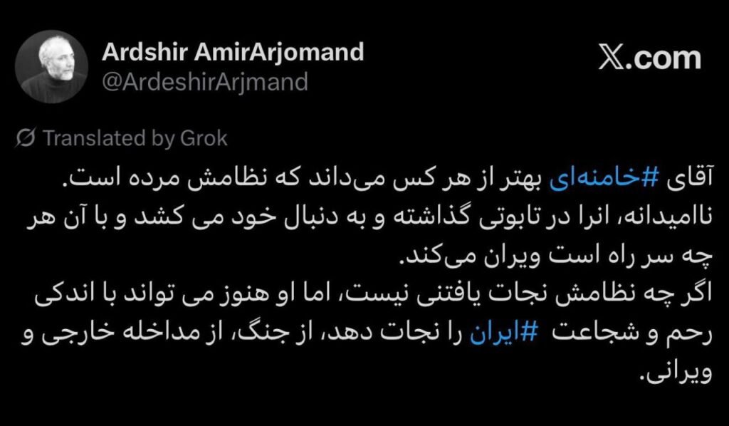 آقای #خامنهای بهتر از هر کس میداند که نظامش مرده است. ناامیدانه، انرا در تابوتی گذاشته و به دنبال خود می کشد و با آن هر چه سر راه است ویران میکند. اگر چه نظامش نجات یافتنی نیست، اما او هنوز می تواند با اندکی رحم و شجاعت #ایران را نجات دهد، از جنگ، از مداخله خارجی و ویرانی.