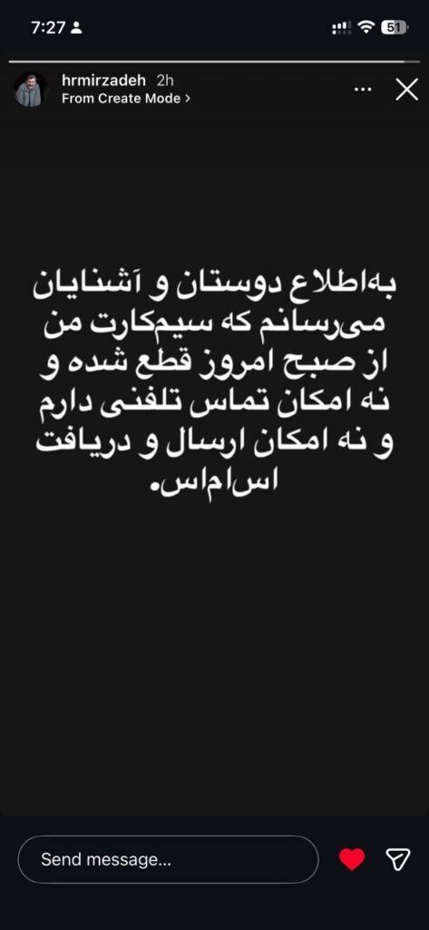 39میرزاده این خبر را در استوری اینستاگرامش منتشر کرد. ممکن است به موارد زیر علاقهمند باشید تکذیب استعفای عارف / حضرتی: هیچ تغییری در کار نیست نماینده اصولگرا: همه نمایندگان مجلس سیم کارت سفید دارند/ رفع فیلترینگ دور نیست چراغی که به خانه روا بود را در مسجد آویزان کردند سید محمد خاتمی: «ای ایران» گفتن کافی نیست، باید نسبت به ایران اهتمام عملی داشت