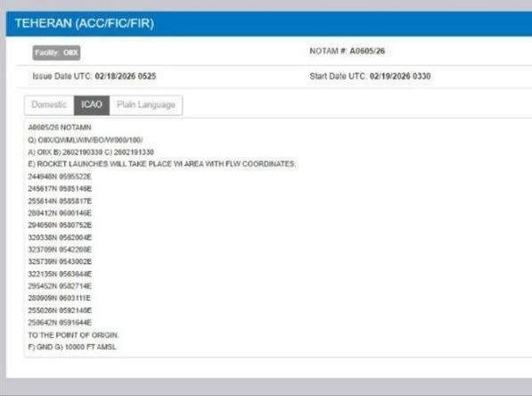 خانهسیاستایران با صدور نوتام A0605/26 اعلام کرد که در تاریخ 19 فوریه (۳۰ بهمن)، در بازه ۰۳:۳۰ تا ۱۳:۳۰ به وقت جهانی (۰۷:۰۰ تا ۱۷:۰۰ به وقت ایران) پرتابهای موشکی انجام خواهد شد