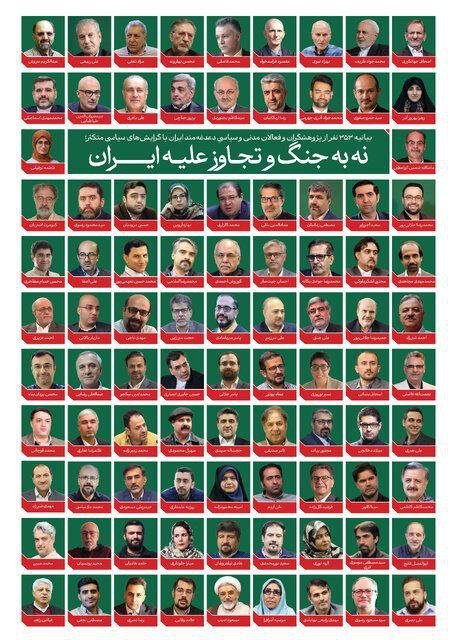 ۳۵۳ نفر از «پژوهشگران، فعالان مدنی و سیاسی و دغدغه‌مندان ایران» با طیف وسیعی از گرایش‌های متکثر بیانیه‌ای با عنوان «نه به جنگ و تجاوز علیه ایران» امضا و منتشر کرده‌اند و از عموم شهروندان دعوت کرده‌اند صدایشان علیه جنگ و تجاوز به ایران را بلند کنند.