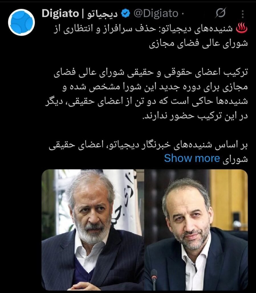 60♨️ شنیدههای دیجیاتو: حذف سرافراز و انتظاری از شورای عالی فضای مجازیترکیب اعضای حقوقی و حقیقی شورای عالی فضای مجازی برای دوره جدید این شورا مشخص شده و شنیدهها حاکی است که دو تن از اعضای حقیقی، دیگر در این ترکیب حضور ندارند.بر اساس شنیدههای خبرنگار دیجیاتو، اعضای حقیقی شورای… pic.twitter.com/hCr25FNVCv— Digiato | دیجیاتو (@Digiato) November 8, 2025 ممکن است به موارد زیر علاقهمند باشید مرضیه محمودی خبرنگاری که درباره کمبود روغن در بازار توییت زده بود به پرداخت ۴۰ میلیون تومان جریمه نقدی محکوم شد توصیه یوسف پزشکیان به داوطلبان ردصلاحیتشده انتخابات شورای شهر معاون پزشکیان: حاضرم لحاف و تشک در صداوسیما بیندازم و هر شب حضور پیدا کنم شهردار تهران: مردم خروس جنگی نمیخواهند!