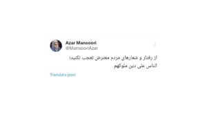آذر منصوری، رئیس جبهه اصلاحات: از رفتار و شعارهای مردم معترض تعجب نکنید