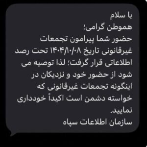 هشدار پیامکی سازمان اطلاعات سپاه به کسانی که در محدوده اجتماعات اعتراضی امروز بوده یا شرکت داشتند