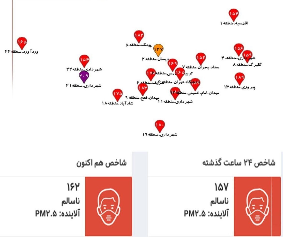 13 ممکن است به موارد زیر علاقهمند باشید افزایش غلظت آلایندههای جوی در اکثر مناطق کشور پلیس راهور: ۸۰ درصد تصادفات موتورسیکلت منجر به صدمه جدی بدنی و مرگ میشود! لغو تمام کنسرت ها در برج میلاد، تا پایان سال! وضعیت نارنجی هوای تهران؛ گروههای حساس در خانه بمانند