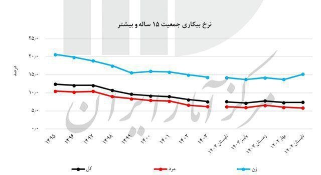 11 مرکز آمار:در بهار ۱۴۰۴ نرخ بیکاری جمعیت ۱۵ ساله ۷.۳ درصد و در تابستان ۱۴۰۴ نیز ۷.۴ درصد اعلام شده است.نرخ بیکاری جمعیت ۱۵ تا ۲۴ ساله در بهار ۱۴۰۴ نیز ۱۹.۷ درصد و تابستان ۱۴۰۴ نیز ۱۹ درصد اعلام شده است.در بهار ۱۴۰۴ نیز نرخ بیکاری جمعیت ۱۸ تا ۳۵ ساله ۱۴.۵ درصد و تابستان۱۴۰۴ نیز ۱۴.۴ درصد اعلام شده است. ممکن است به موارد زیر علاقهمند باشید وزیر آموزش و پرورش: آدمهایی که هیچ ارتباطی با نظام تعلیم و تربیت ندارند برای این نظام به هر حال تعیین تکلیف میکنند رضا حاجیکریم، رئیس هیئت مدیره فدراسیون صنعت آب ایران: تهران از نقطه صفر آبی خیلی وقت است که گذشته هم اکنون بارش برف در همدان رئیس سازمان ثبت اسناد: ۲۰ تا ۳۵ میلیون قطعه زمین و ملک قولنامهای در کشور وجود دارد