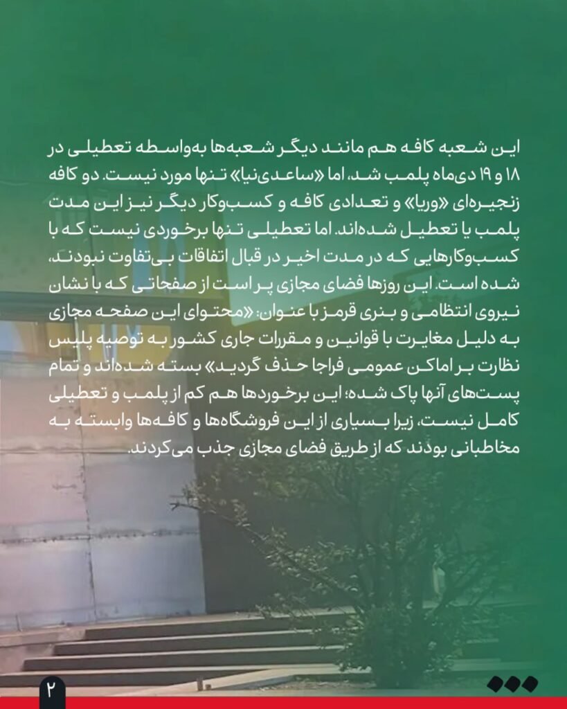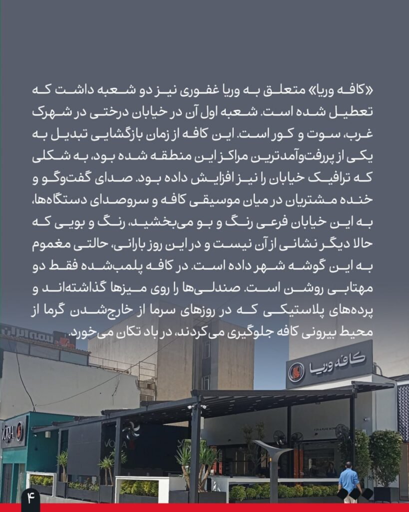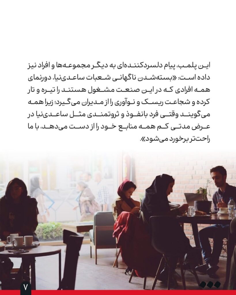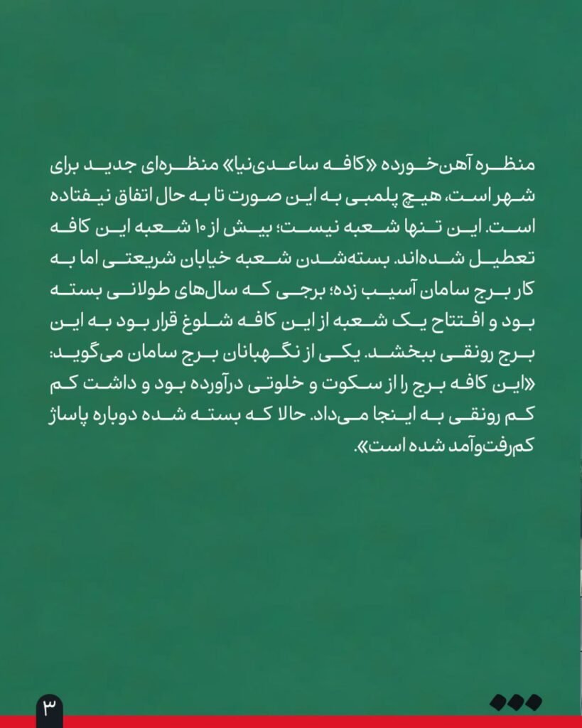 ورقههای فلزی به واحد مستقر در طبقه اول برج سامان در خیابان شریعتی شکلی ترسناک داده است. باران که با شدت در حال باریدن است، به این صفحات فلزی میزند، کمانه میکند و بر سر عابران میخورد؛ عابرانی که در شرایط عادی میتوانستند برای فرار از این باران به درون این شعبه از «کافه ساعدینیا» بروند و با قهوه یا شیرینی منتظر کاهش شدت باران و باد باشند. «ساعدینیای برج سامان» بهتازگی افتتاح شده و قرار بود کاسبی آن منطقه را رونق دهد.