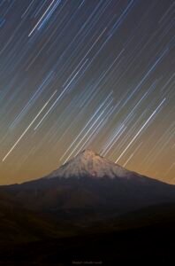 رد نور ستاره های صورت فلکی شکارچی بر فراز دماوند در مدت ۲۰ دقیقه عکاسی