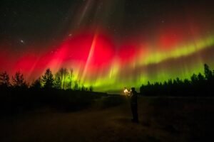طبیعت در نمایش تازهاش می درخشد / برف سرخ زیر نور شفق قطبی