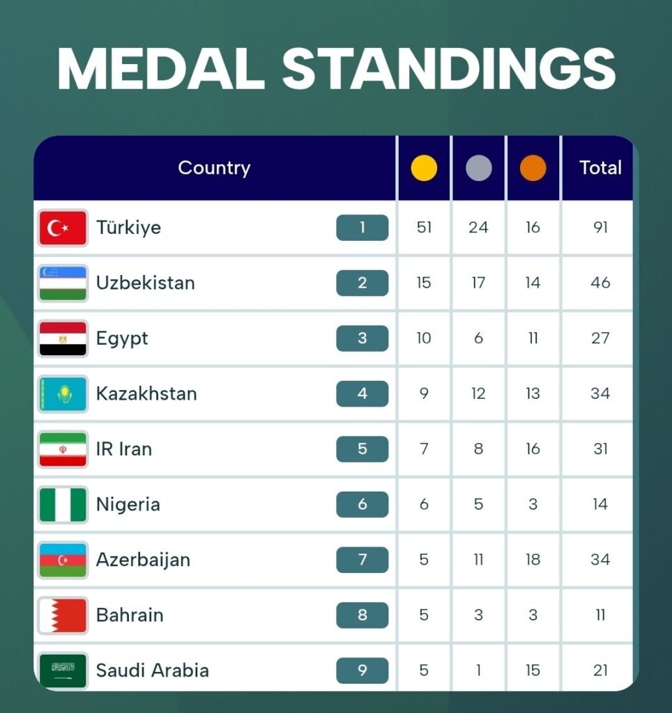 در پایان سومین روز از آغاز رسمی بازی های همبستگی کشورهای اسلامی ایران با 7 طلا، 8 نقره و 16 برنز در جدول رده بندی مدالی قرار دارد.