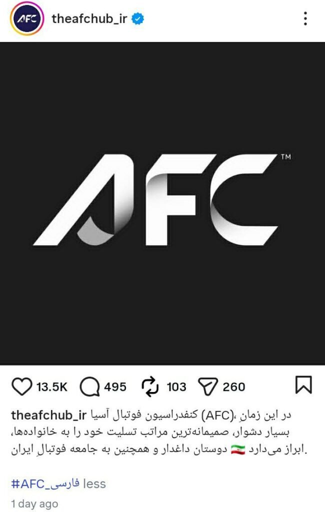خانهورزشایافسی به فارسی نوشت: «کنفدراسیون فوتبال آسیا در این زمان بسیار دشوار، صمیمانهترین مراتب تسلیت خود را به خانوادهها، دوستان داغدار و همچنین به جامعه فوتبال ایران ابراز میدارد.»